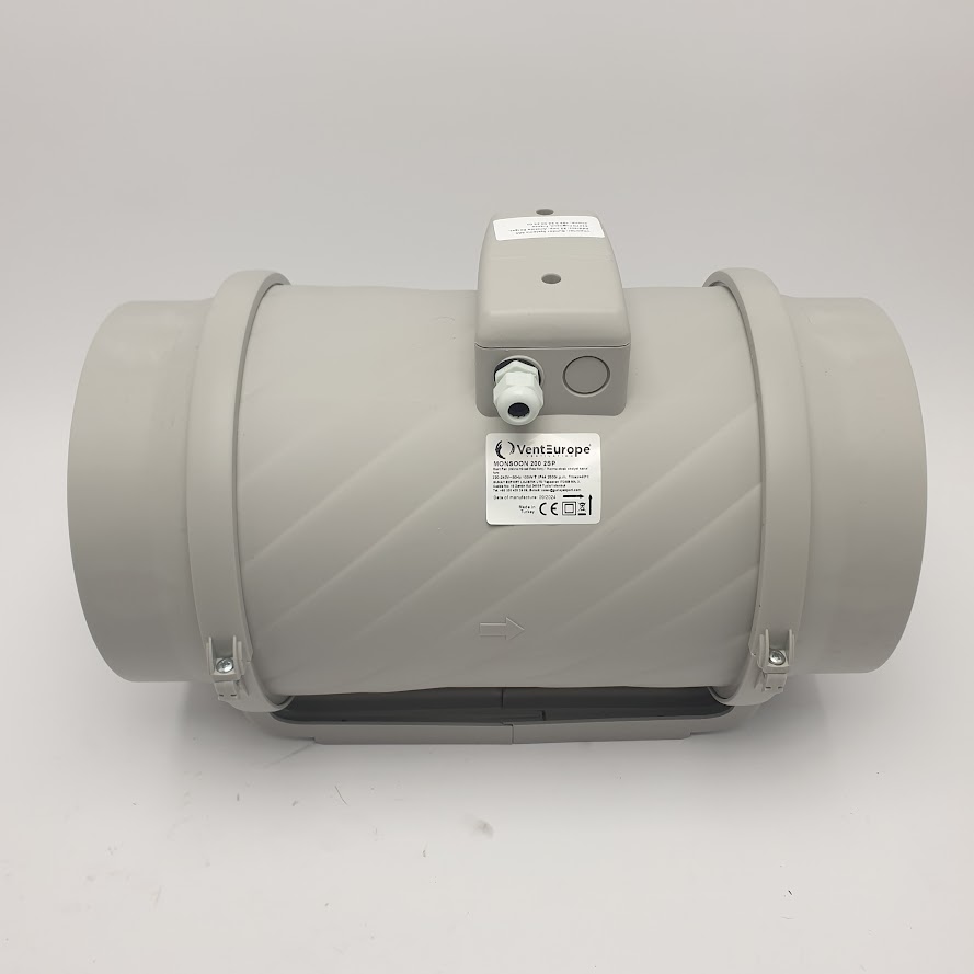 Ventilateur mixte MONSOON deux vitesses D200 : ventilateur en ligne combinant fonctions d’extraction et d’insufflation, généralement à deux vitesses , avec indice de protection typique IP44.