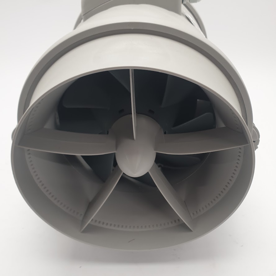 Un ventilateur à flux mixte associe les avantages des ventilateurs axiaux (faible encombrement, fonctionnement silencieux) et centrifuges (pression modérée, débit efficace). La conception inclut un rotor à pales courbes couplé à un diffuseur pour optimiser le flux d’air tout en limitant les turbulences.