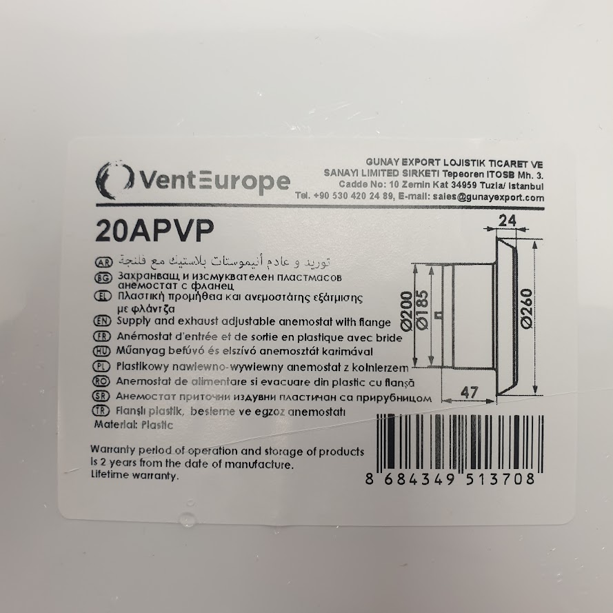Anémomètre réglable d\'alimentation et d\'évacuation 20APVP bride en plastique ABS D200